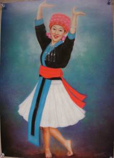 Women clothes are colorful with different textures and designs, and from the way they wear. Women are always wearing two aprons, one in the front and one in the back with original color inner black and outer blue stripe. The shirt in the upper back has a small decorative apron. On the waist, there are either plain colors blue/light red sacks or light green/red sacks that wrapped around. The sacks are handmade with decorative art works on it or a plain red nylon one piece long sack is also an optional. On the neck are silver necklaces. On the handcuff sleeves color blue at end. Women are also wear the hate-dress with one inch sack that wrapped around the hate-dress in white and black stripe.
