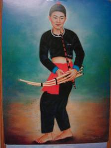 The men’s wears are also consisting of a pant, and a shirt. The colors on both are black. The shirts are designed shorter and ended at the belly level. Both sleeves are ended with the blue color on the cuff area as to the women. The men are also wear necklaces (optional) but the men’s necklaces are only one piece around the neck. Men are often carried the Bamboo Instruments called “Qeej”.